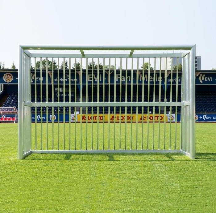 aus Aluminium-Spezialprofil mit einer Torgröße von 5 x 2 m bzw. 3 x 2 m. Mit dicken Ballfangrohren aus 30 mm Rundrohr. Diese Tore haben sich seit Jahren aufgrund der besonderen Stabilität und Qualität hervorragend auf dem Bolzplatz bewährt. Da der Hinterbau komplett aus Aluminium ist, benötigen die Tore keine Tornetze, so dass hohe Folgekosten, z.B. durch ständiges Zerstören von Netzen, vermieden werden. Die Super-Bolztore sind freistehend und komplett mit Bodenrahmen mit 4 angeschweißten Laschen für die Bodenverankerung ausgerüstet. GS-Geprüft nach DIN-EN 15312. Hervorragendes Preis-Leistungs-Verhältnis unter Berücksichtigung der Stabilität und Qualität.