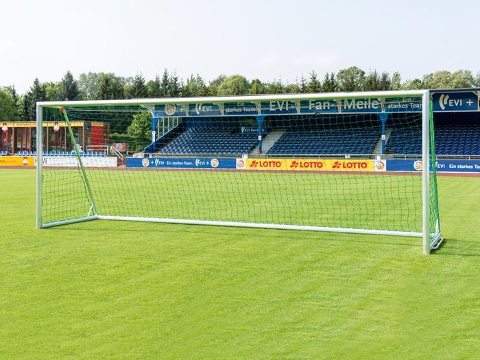 Aluminium Fußballtor Größe 7,32 x 2,44 m, Seniorentor, eckverschweißt, aus besonders profiliertem Aluminium-Oval-Profil (120 x 100 mm) mit Innenversteifungen. Obere Netztiefe ca. 80 cm, untere Tiefe 1,5 m bzw. 2 m.