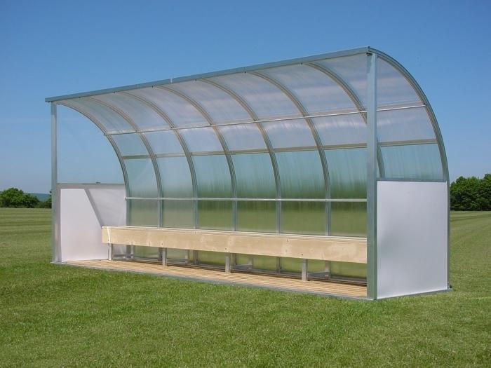 Eine stabile Konstruktion aus Alu-Profilen in Kombination mit Kunststoff-Platten. Durch die runde Dachform ist diese Spielerkabine ein echter Blickfang für jeden Sportplatz. Die Seitenteile sind oben aus Acrylglas, unten sind weiße Alucobondplatten verbaut. Die Dachplatten sind standardmäßig aus UV-beständigen Polycarbonat-Doppelstegplatten. Wahlweise können wir die Kabine auch mit Dachplatten aus Acryl total transparent liefern. So können die Zuschauer auch hinter der Kabine dem Spielverlauf folgen.